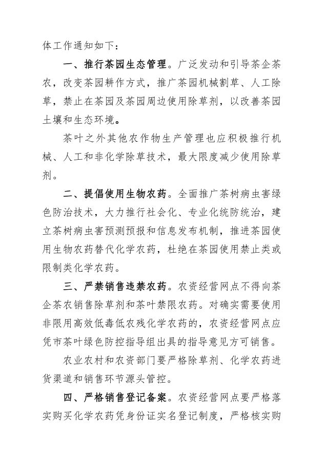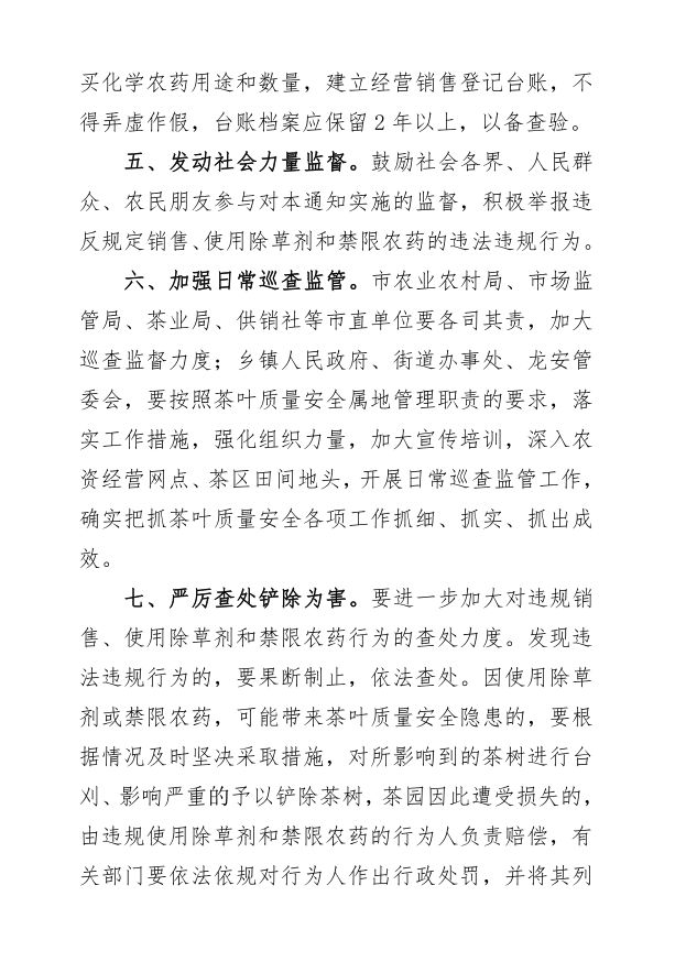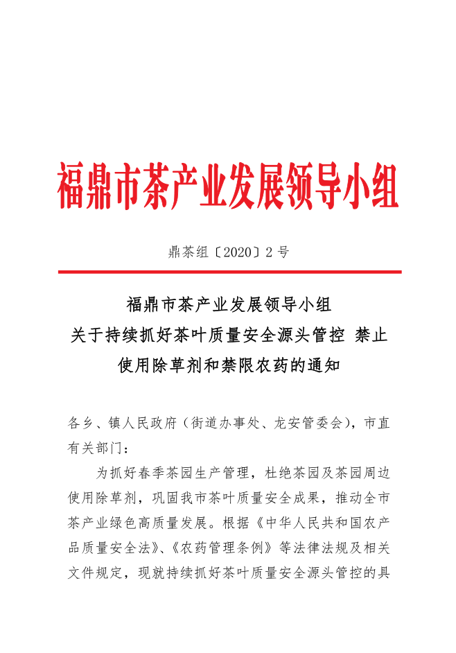为抓好茶园生产管理,杜绝茶园及茶园周边使用除草剂,巩固我市茶叶质量安全成果,推动全市茶产业绿色高质量发展。根据《中华人民共和国农产品质量安全法》、《农药管理条例》等法律法规及相关文件规定,福鼎市茶产业发展领导小组下发《关于持续抓好茶叶质量安全源头管控 禁止使用除草剂和禁限农药的通知》,持续抓好茶叶质量安全源头管控工作。